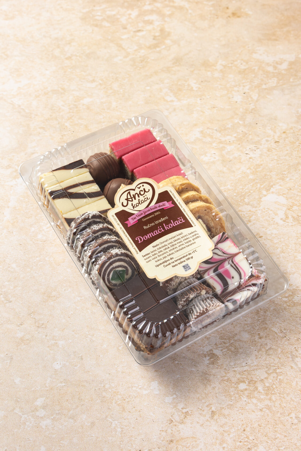 Rolat u oblandi, filovan masom od keksa i oraha. U sredini se nalazi čoko bananica što mu daje veoma dekorativan izgled.