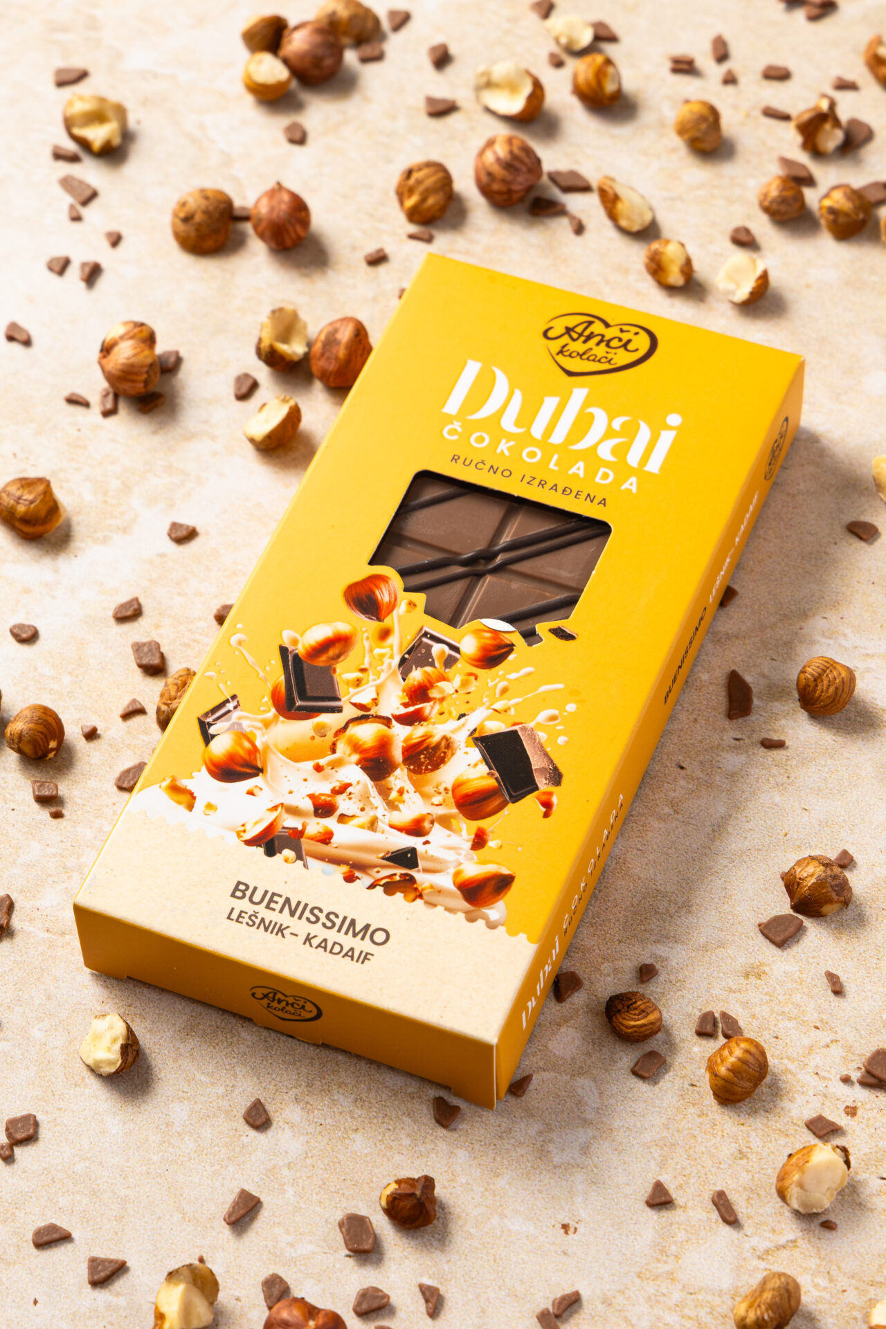 Buenssimo Dubai čokolada kombinuje neodoljivi lešnik krem i delikatni kadaif. Upotpunjen hrskavim vaferom, a dekorisan lomljenim lešnikom.