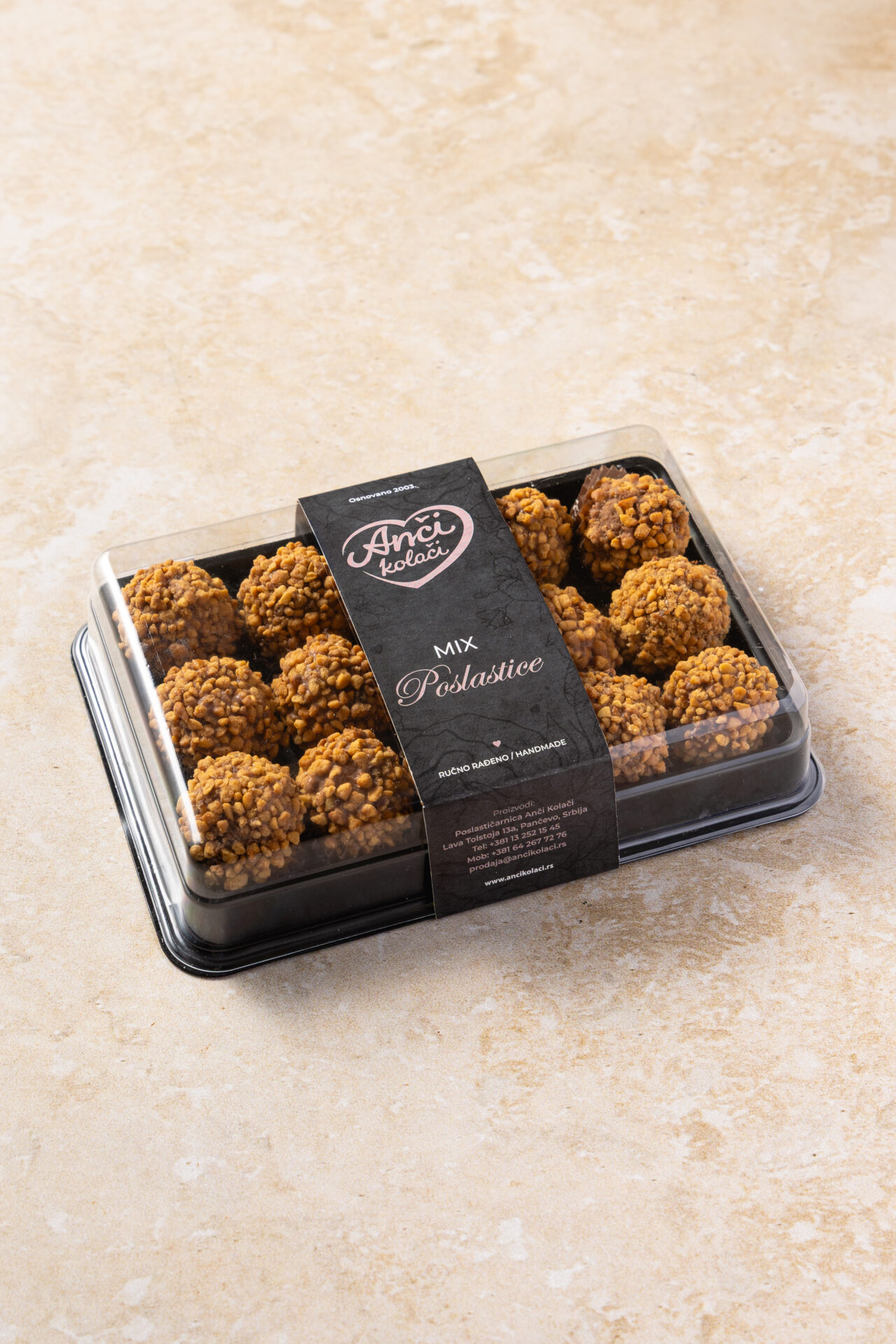 Kuglice od smese mlevenog keksa, oraha, čokolade, lešnika i alkoholnog pića ruma, cele prelivene crnom čokoladom i uvaljane u komadiće karamelizovanog kikirikija.