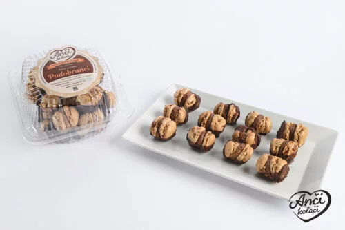 Lagane korice filovane vanil kremom sa lešnik grilijašem i ganašem crne čokolade.
