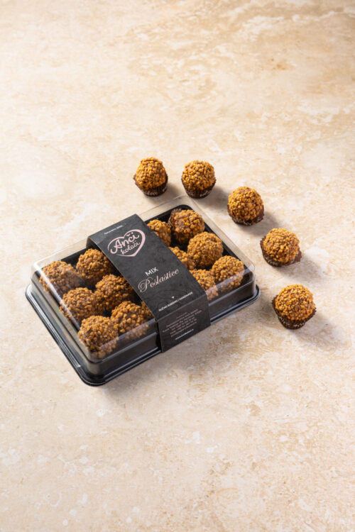 Kuglice od smese mlevenog keksa, oraha, čokolade, lešnika i alkoholnog pića ruma, cele prelivene crnom čokoladom i uvaljane u komadiće karamelizovanog kikirikija.